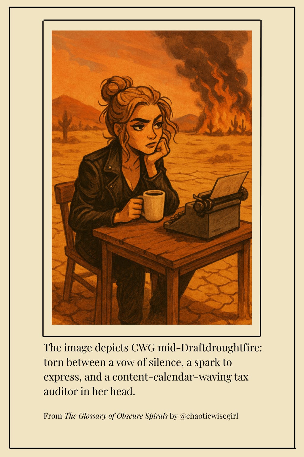 Draftdroughtfire is not just the absence of words, but the cracked-dry quiet that meets you when your desire to express collides with pressure, rebellion, despair, hope, and the need to earn an income. A drought and a wildfire at once, reminding you — ironically enough, through the act of expression (however awkward or semi-reluctant) — to taste the faint drip of life… That strange communal cocktail flowing through your veins and the planet’s veins alike.